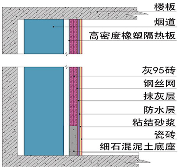 烟道隔热防裂结构,隔热板、红砖陡砌、挂网抹灰、贴砖宝贴砖,可有效防止烟道瓷砖空鼓、脱落。