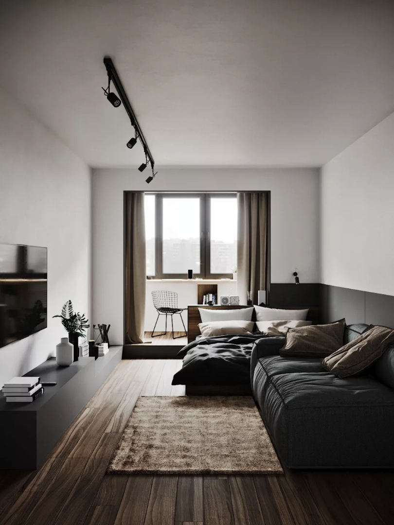 卧室的设计则以简约风提升温馨感,内部配套应有尽有,浅棕色窗帘搭配白色窗框,白色电视墙白色衣柜简单大方,黑色床头柜灰色地毯纯粹低调,整体空间给人舒服适宜的体验。