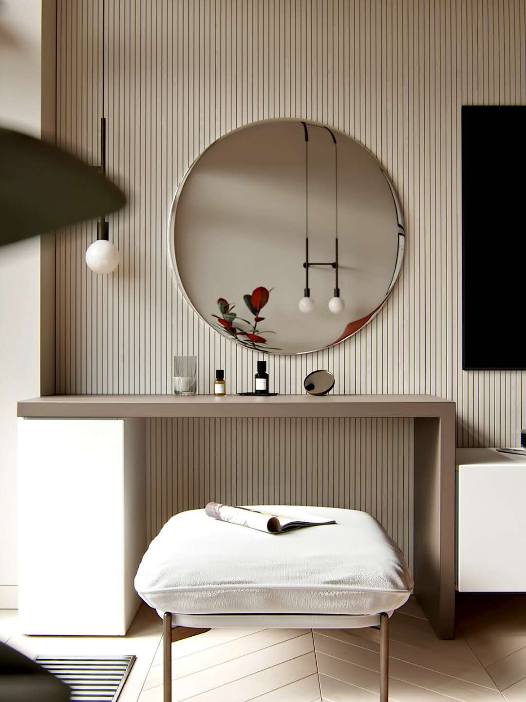 用一面镜子做隔墙装饰,能大大的增加视觉上的空间效果。靠墙搁置的展架上摆放一个花瓶、一瓶香氛做空间装饰,简简单单的向人们传递了主人的艺术气息,也不过分张扬。