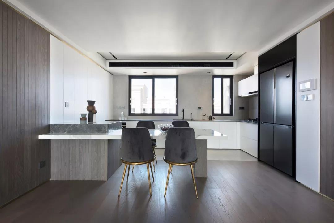 餐厨一体的设计手法在当下很是流行,一方面可以最大化的利用空间,另一方面再将餐厅与客厅一以贯之,同时也增强了家人之间的互动性。屋内光线格外通透,视线更加开阔,有利于增进家人间更为密切的情感交流,在这样的氛围中开启自在舒适的休闲与用餐体验,我想你会更爱居家生活。