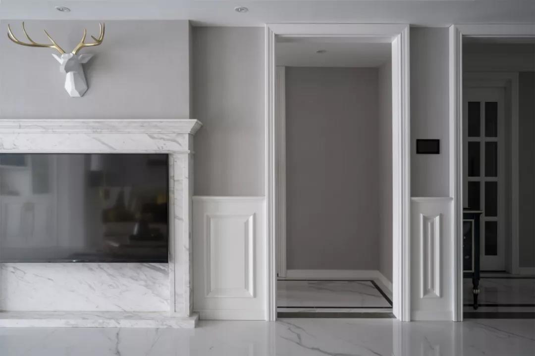 在客厅,设计融合了美式与轻奢的精髓,通过简化的石膏线条、鹿头墙饰、皮质沙发及绒面靠椅等带来经典的美式风格,理石桌子加上金属底座的点缀,则让空间自然而然地透露着轻奢的质感。