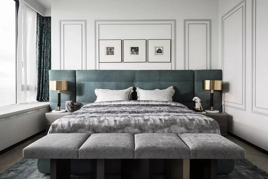 墨绿与浅灰相间的反绒床品、黑白艺术挂画、艺术手工制作的蓝绿色反光镜面壁饰等,简雅低调的质感美充斥在每一个角落。
