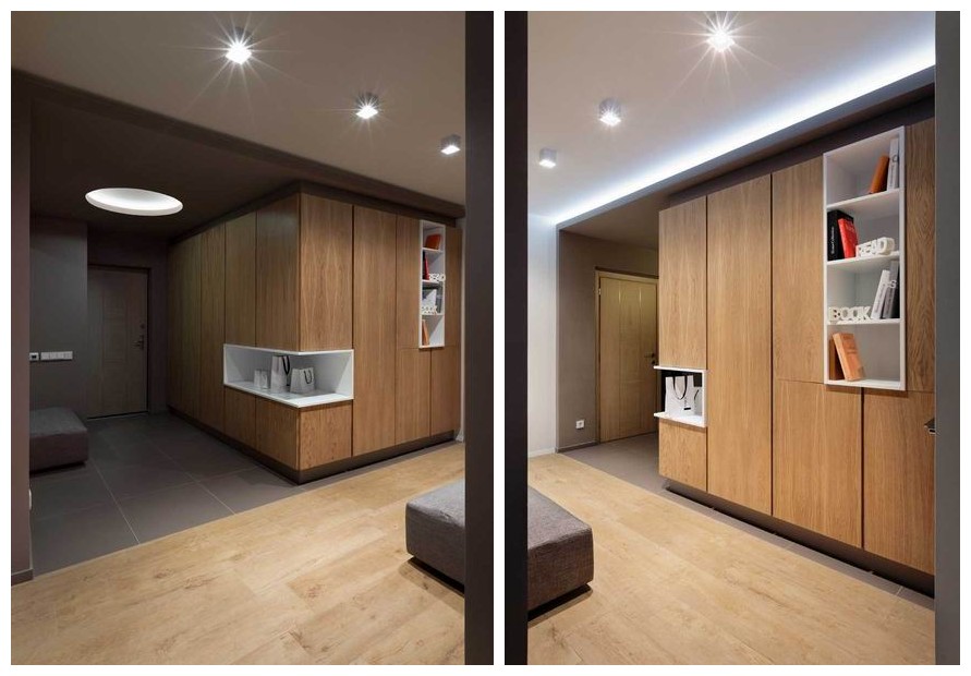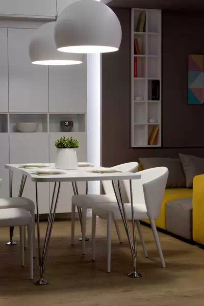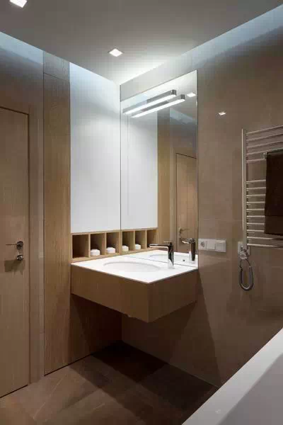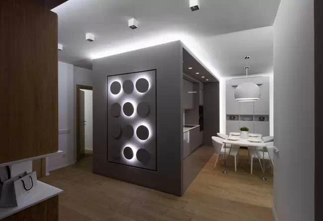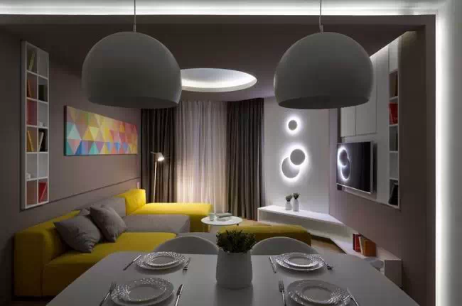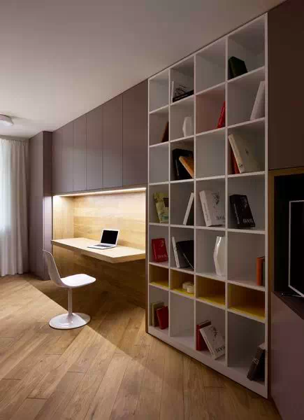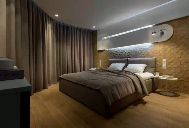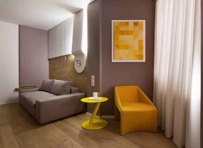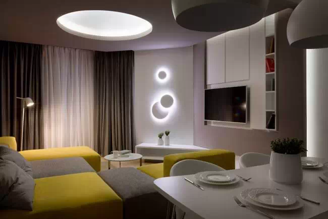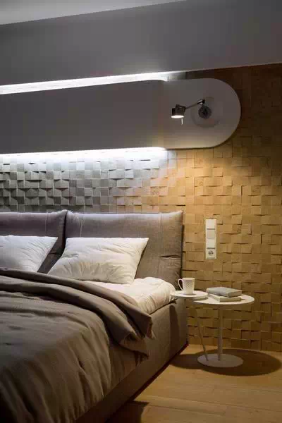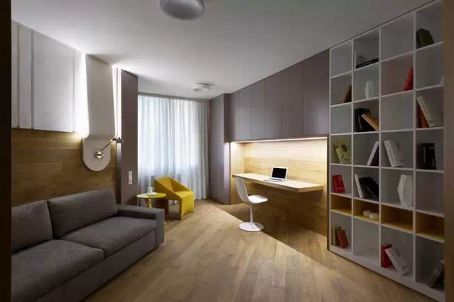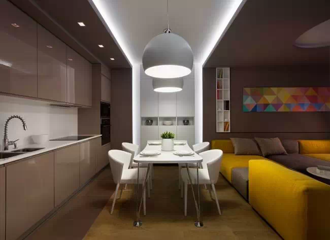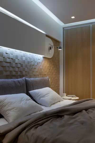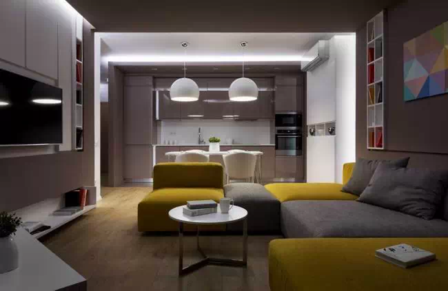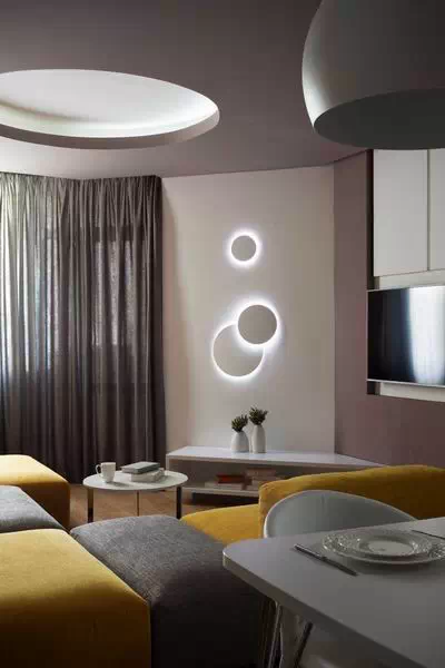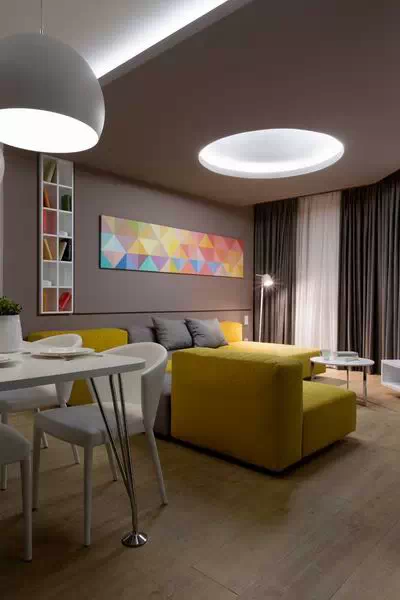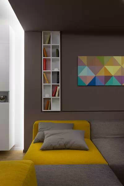 用灰色贯穿整个空间,使空间看起来低调稳重,为了不显乏味,设计师利用姜黄色做点缀,在色彩上首先有所突破,在配饰上,几处灯饰的处理显示出了空间的层次感。